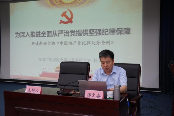 會(huì)上,市紀(jì)委監(jiān)委第七監(jiān)督檢查室主任楊文喜以“為深入推進(jìn)全面從嚴(yán)治黨提供堅(jiān)強(qiáng)紀(jì)律保障”為題,為集團(tuán)全體黨員干部解讀新修訂的《中國(guó)共產(chǎn)黨紀(jì)律處分條例》。主要從《條例》的重要意義、特點(diǎn)、主要內(nèi)容以及如何抓好《條例》的學(xué)習(xí)貫徹執(zhí)行等四個(gè)方面進(jìn)行了詳細(xì)講解。