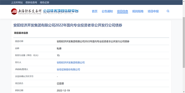12月16日,集團(tuán)收到上海證券交易所通知,集團(tuán)報(bào)送的非公開發(fā)行公司債券并掛牌轉(zhuǎn)讓的申請(qǐng),上交所按照相關(guān)規(guī)定已予受理。本期債券名稱為安陽經(jīng)濟(jì)開發(fā)集團(tuán)有限公司2022年面向?qū)I(yè)投資者非公開發(fā)行公司債券,品種為私募債,金額15億元,承銷商/管理人為安信證券。