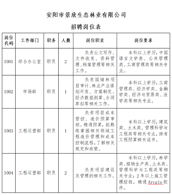 安陽市景欣生態(tài)林業(yè)有限公司(以下簡稱“景欣林業(yè)”)是安陽市國家儲備林建設(shè)PPP項目公司,根據(jù)工作發(fā)展需要,擬委托安陽鼎泰勞務(wù)派遣有限責任公司(以下簡稱“鼎泰公司”)面向社會公開招聘6名工作人員?,F(xiàn)將有關(guān)事項公告如下: