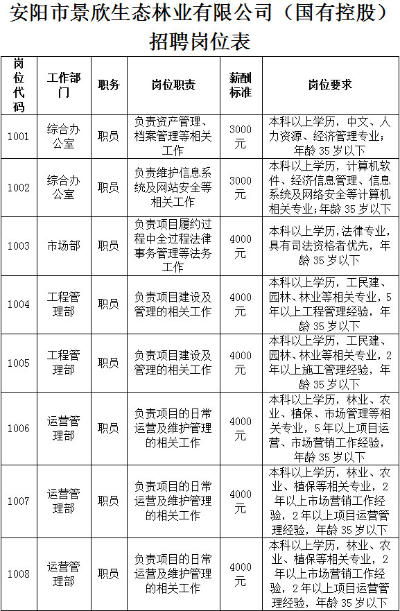 根據(jù)工作發(fā)展需要,現(xiàn)委托安陽(yáng)鼎泰勞務(wù)派遣有限責(zé)任公司面向社會(huì)公開(kāi)招聘8名員工,派遣至安陽(yáng)市景欣生態(tài)林業(yè)有限公司工作。現(xiàn)將有關(guān)事項(xiàng)公告如下:
